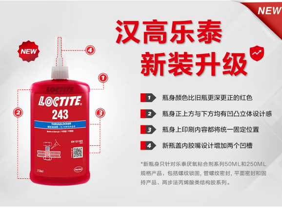还有咱们乐泰243胶水换包装了,关于汉高乐泰胶水新瓶,新包装新的设计理念是:独特设计有别于其他品牌,保护用户,远离仿品,免受困扰。